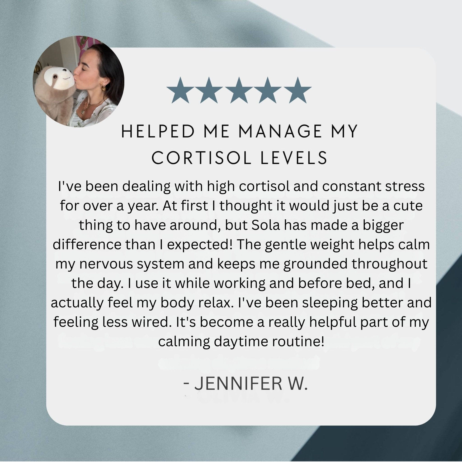 "Working from home feels completely different now. Sola stays on my shoulders while I work, and I feel calmer and more focused all day". - Christina R.